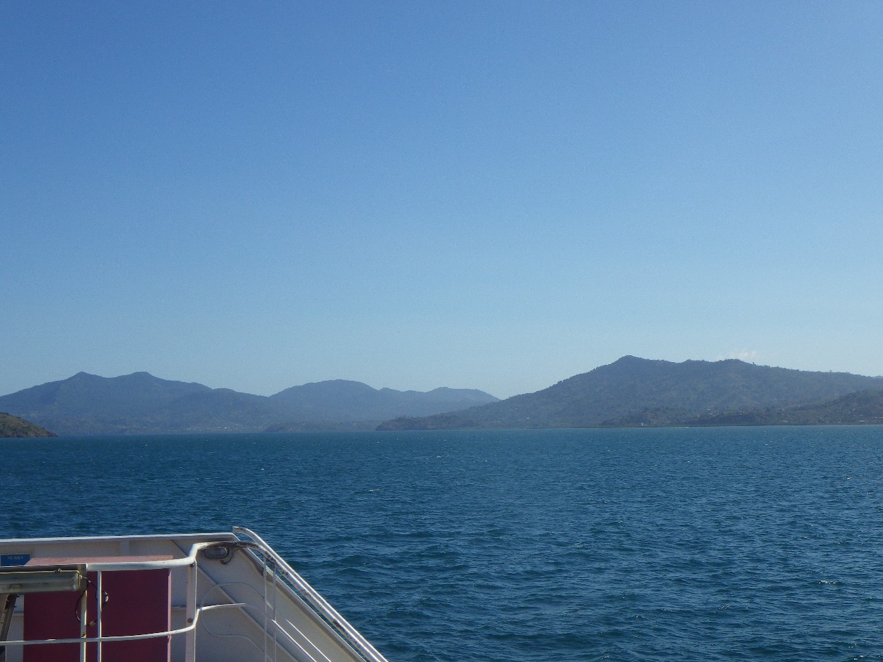 Après plus de 20h de trajet, nous voilà enfin à Mayotte, et plus précisemment sur "Petite Terre" où se trouve l'aéroport. Je ne peux me vanter d'avoir vécu des milliers d'atterrissages, mais celui-ci était pour le moins surprenant, grâce à une piste construite sur une langue de terre gagnée sur l'océan on se serait cru dans un hydravion. Le dépaysement est total dès notre sortie, une minuscule aérogare avec en fond palmiers, cocotiers et pas un immeuble de plus de 2 étages. Une fois nos 12 valises récupérées, atteignant à la pesée la modique somme de 158kg, nous retrouvons nos chats exténués et transpirants et pouvons enfin sortir au grand jour où pour la première fois de ma vie une pancarte nous attendait "Famille MELANO/ROUX"!! Direction donc l'hôtel où nous passerons une semaine avant de pouvoir emménager dans notre maison de brousse. Trevani, le nom de la commune et de notre havre de paix se trouve à une quinzaine de kilomètres de l'aéroport, pour y arriver il nous faut d'abord prendre la barge et regagner "Grande Terre"où Mamoudzou la capitale voit débarquer chaque jour touristes, militaires et locaux. Ce fût notre première vision de Mayotte... On la pensait petite (376km²), elle nous paraît immense. Nous pouvons distinguer quelques plages, la mangrove et des monts qui culminent à près de 600 mètres.